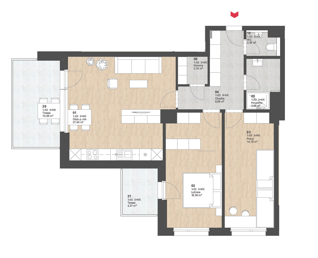Zobrazený půdorys bytu, včetně zakresleného vybavení a spotřebičů, je pouze ilustrativní.