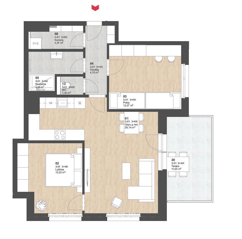 Zobrazený půdorys bytu, včetně zakresleného vybavení a spotřebičů, je pouze ilustrativní.