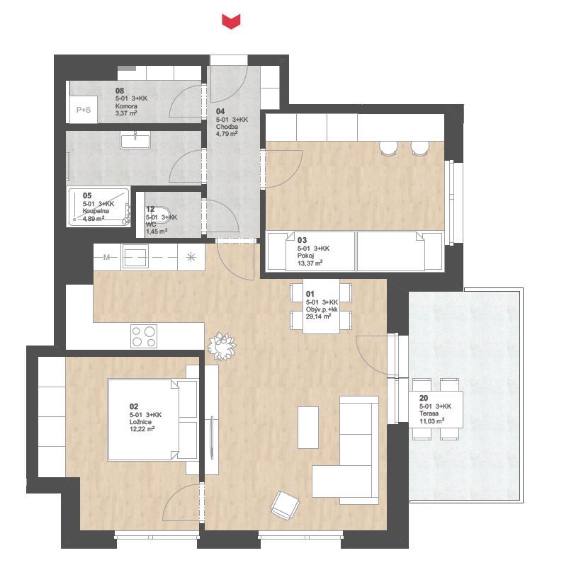 Zobrazený půdorys bytu, včetně zakresleného vybavení a spotřebičů, je pouze ilustrativní.