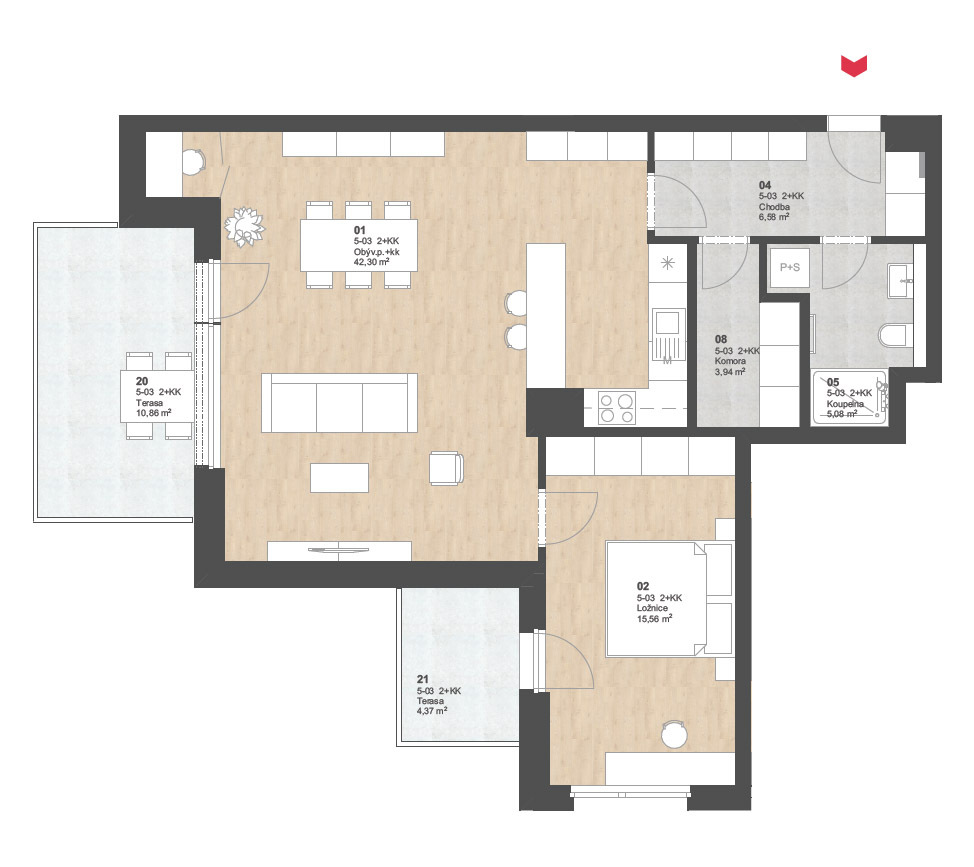 Zobrazený půdorys bytu, včetně zakresleného vybavení a spotřebičů, je pouze ilustrativní.